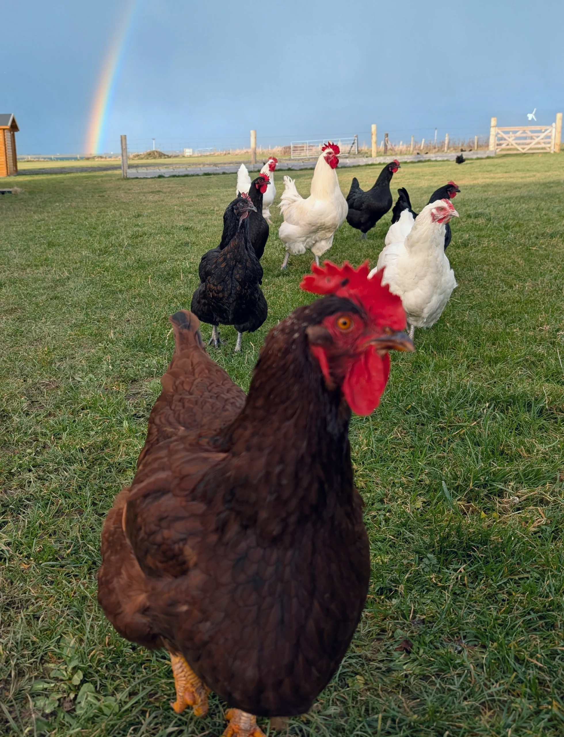 We have a flock of friendly chickens who enjoy roaming around the grounds. They might come say hi every once in a while.